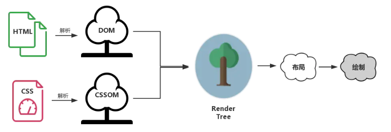 渲染过程说白了,首先是基于 HTML 构建一个 DOM 树,这棵 DOM 树与 CSS 解释器解析出的 CSSOM 相结合,就有了布局渲染树。最后浏览器以布局渲染树为蓝本,去计算布局并绘制图像,我们页面的初次渲染就大功告成了。